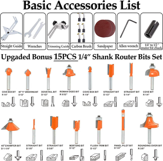 WOOD ROUTER 1.25HP 30000RPM KIT WITH 15 BITS